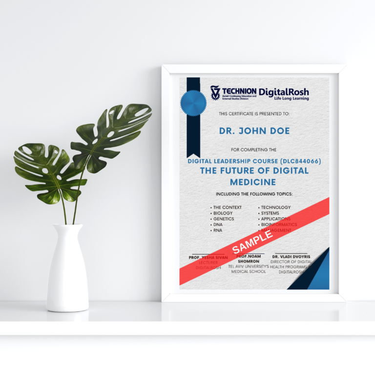 The course is comprised of theoretical lectures, peer learning in small groups and live talks by industry leaders from the innovative Israeli medical ecosystem, together with the extensive corpus of knowledge available to participants on the DigitalRosh website for additional learning during and after the course.