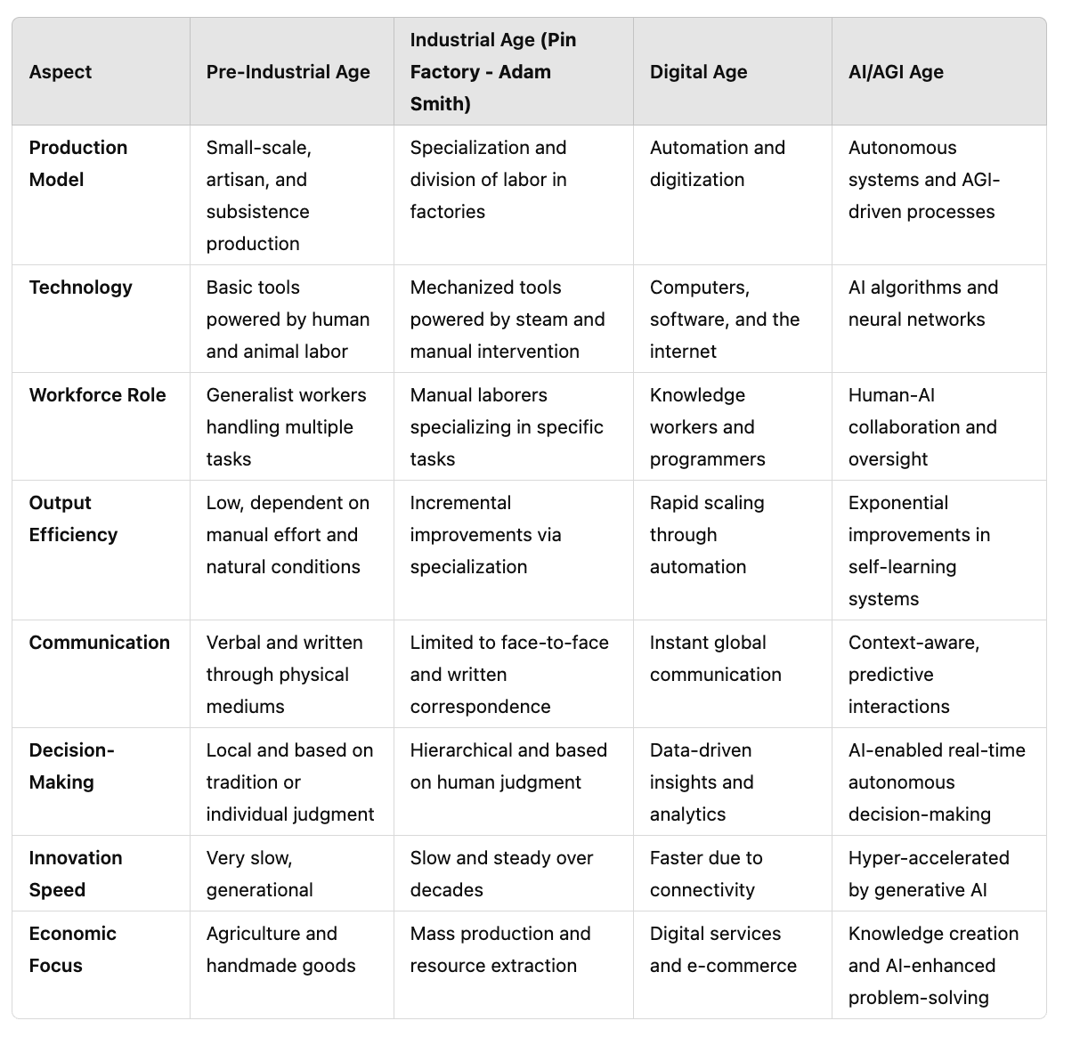 The following table highlights eight key aspects of the changes across distinct periods. Let us assume we are currently in the digital age and will transition to the AI/AGI age within the next decade.