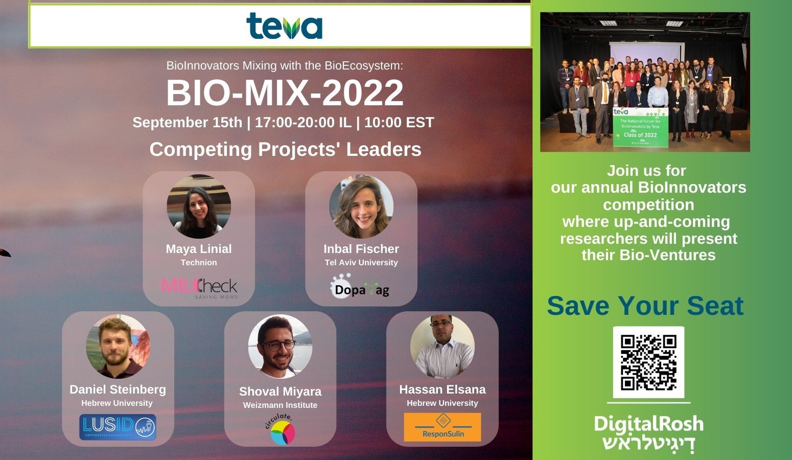 15-ספט-2022 התחרות המסכמת של Bio-Mix 2022 – תכנית היזמות של חברת טבע בשיתוף דיגיטלראש לסיכום למידה עם דוקטורנטים בתחומי הביו