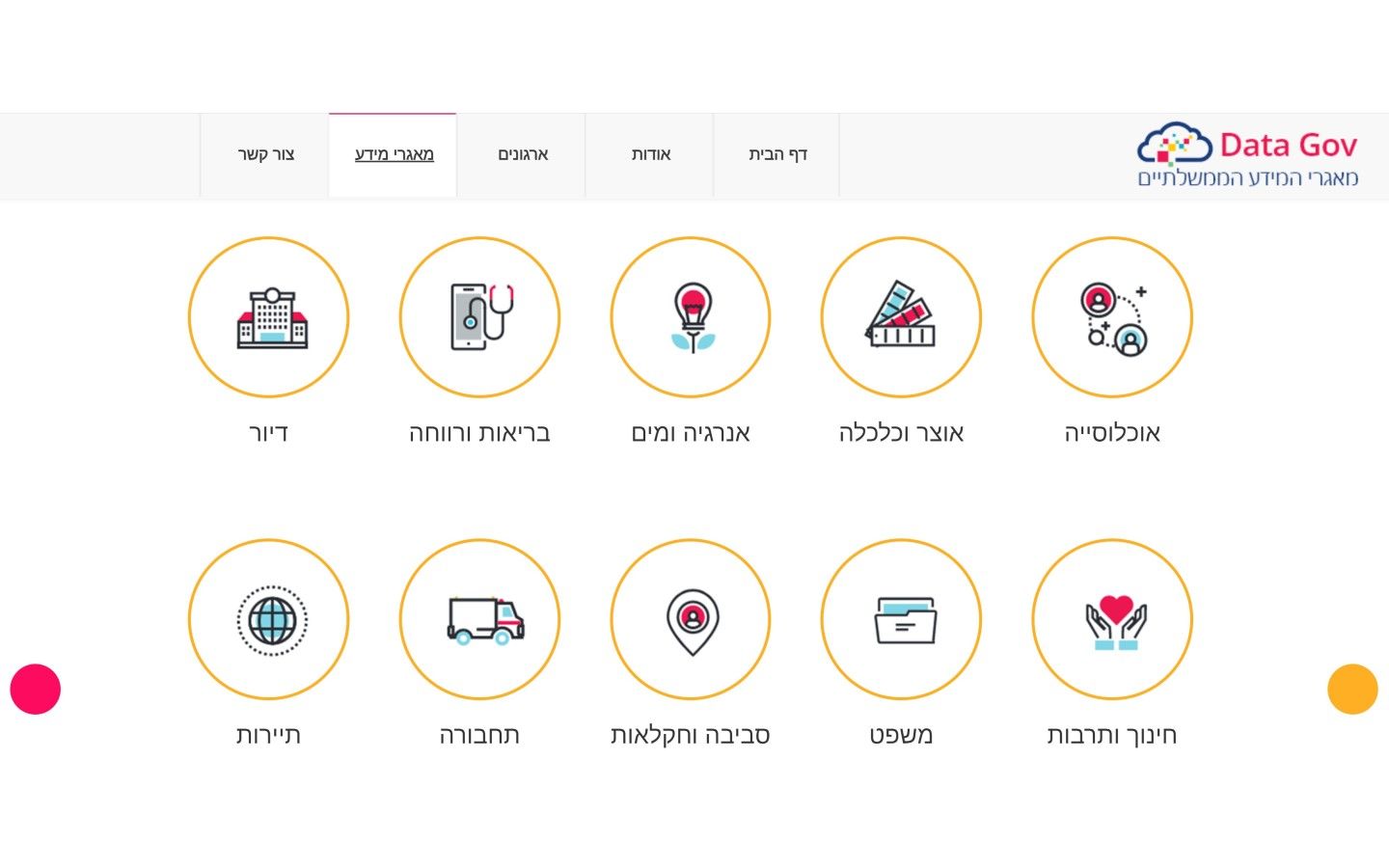 מאגר הנתונים הממשלתי (ישראל data.gov.il) מרכז נתונים פתוחים לציבור ממשרדי הממשלה במגוון נושאים וכולל מדריכים ואפשרויות חיפוש.